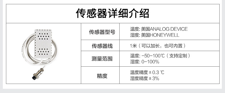 【湿度传感器】:是美国 HONEYWELL 精度±3%, 测量范围:0至 100 %RH